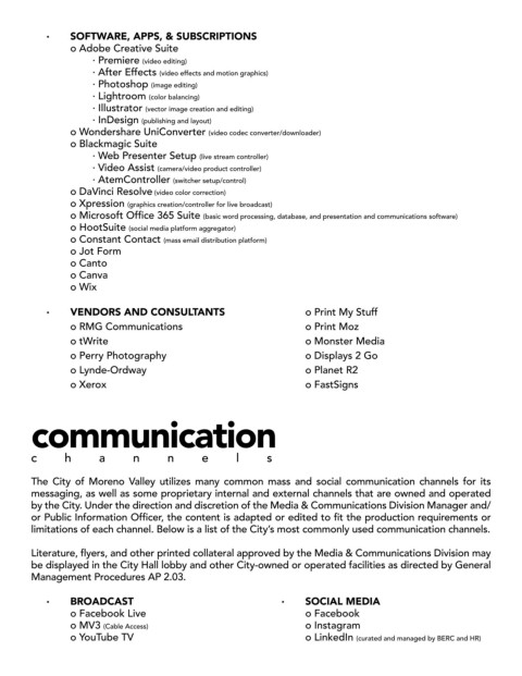 The City of Moreno Valley utilizes many common mass and social communication channels for its