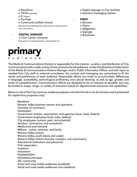 Below is a list of the City’s primary audiences (please note that this list is not all-inclusive and is presented