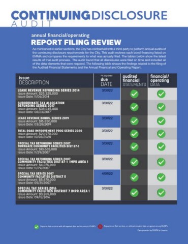 the continuing disclosure requirements for the City. This audit reviews each bond financing listed on
