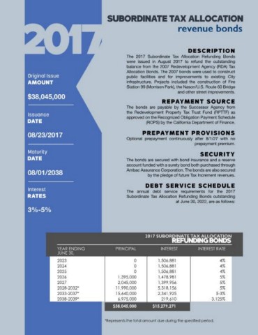 The 2014 Refunding Lease Revenue Bonds were issued in The 2017 Subordinate Tax Allocation Refunding Bonds